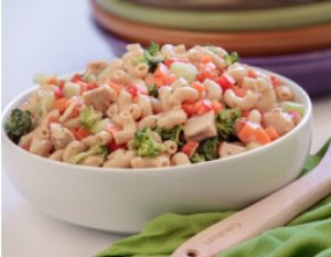 Pour the dressing over the pasta, vegetables, and chicken and mix well. Chill. Serves 4