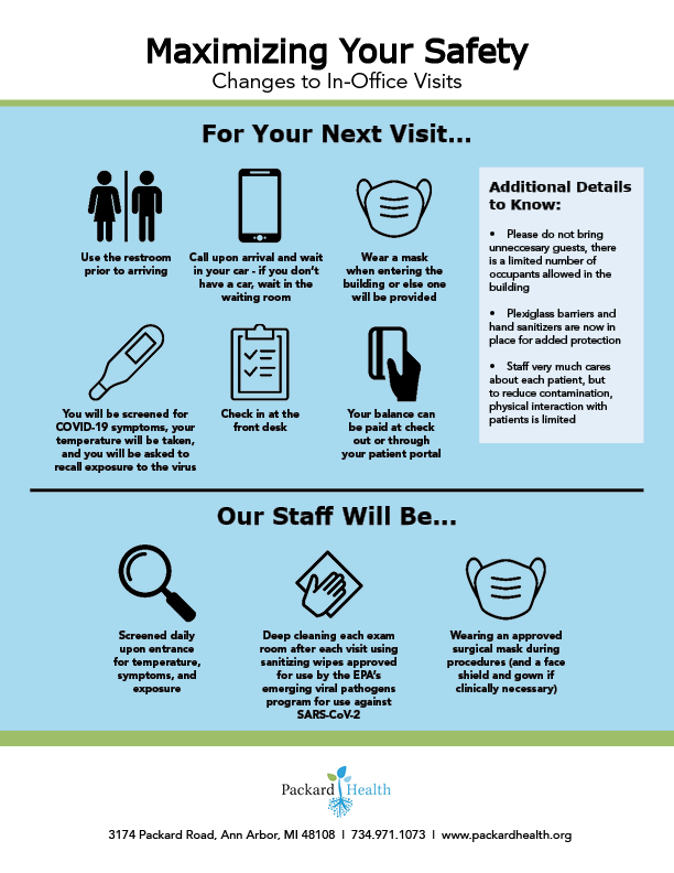 | July 16, 2020 Dear Patients of Packard Health, It’s time for Packard Health to reopen our West health location at 1915 Pauline Boulevard in Ann Arbor. Our patients can begin scheduling in-person appointments for as soon as Monday, July 20, 2020. I would like to restate my assurance to you that our care team has been working to create the safest environment for you and your loved ones by following the latest recommendations from the Centers for Disease Control (CDC) , Occupational Safety and Health Administration (OSHA) , and Michigan Department of Health and Human Services (MDHHS) . Packard Health has established administrative, environmental, and infection procedures and protocols to maximize your safety and that of our staff. Below is a printable chart illustrating how we are working to navigate this ‘new normal.’ Our West location is the last location to reopen. Our Main location at 3174 Packard Road in Ann Arbor has remained open throughout the pandemic. Telehealth visits will remain an option for care, too. Telehealth visits have helped in maintaining care with our patients, but for some are not enough. During Michigan’s stay-at-home order, the global COVID-19 pandemic created a fear of public places, including a doctor’s office. Many patients delayed care for pre-existing conditions that require consistent in-person monitoring. Mental health conditions, new and existing, may have worsened from prolonged isolation. If you’ve been wondering when to come back, now is the time. Packard Health providers, myself included, are ready to assess your needs. Until we meet again, I urge you to continue to social distance, wear your face coverings when in public places, and wash your hands. COVID-19 is still looming, but we have the tools to minimize it in our community. We take your safety and the safety of our staff and community very seriously. Please call us at 734.971.1073 if you have any questions or concerns. We look forward to seeing you soon! |